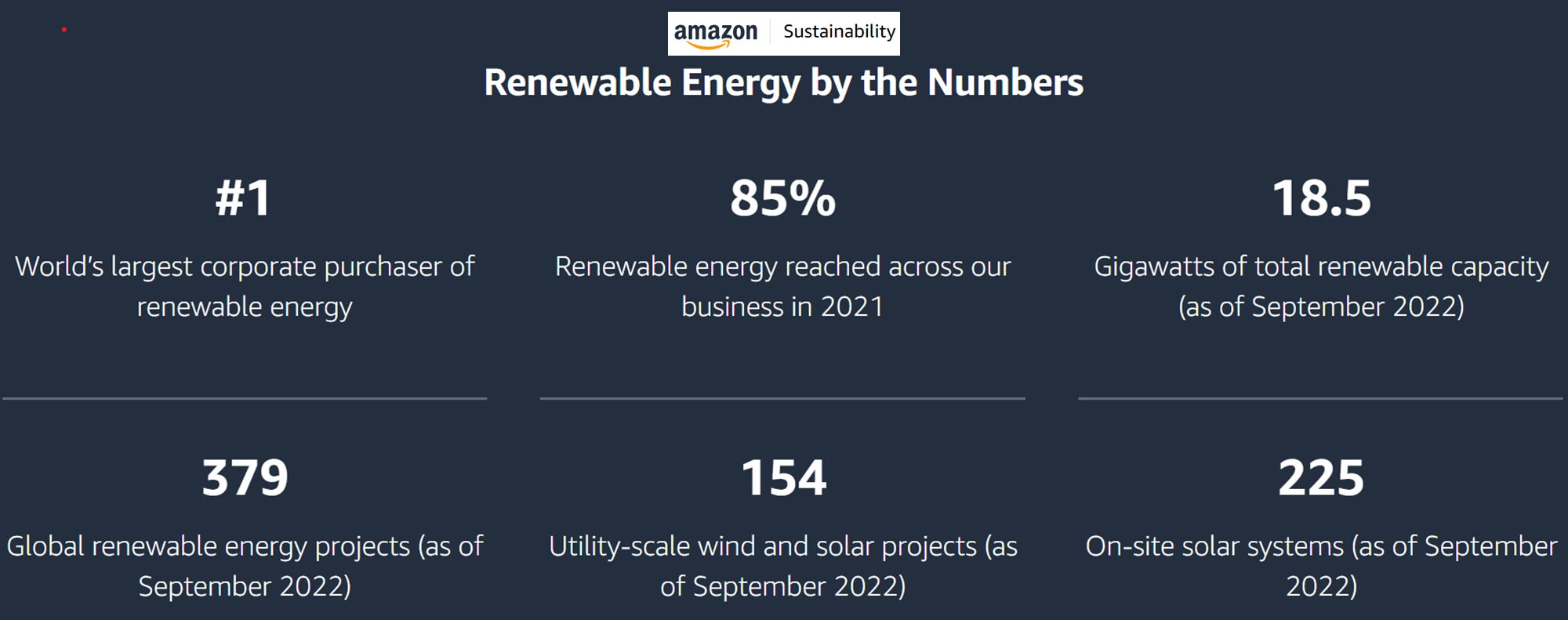 Amazon not only targets meeting its energy needs for its global business units, but it also intends to be carbon neutral by 2040. As per its website, Amazon is the world’s largest corporate purchaser of renewable energy.